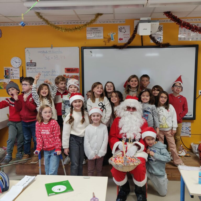 C’est en petit comité (car beaucoup d’enfants étaient malades) que nous avons accueillis le Père Noël dans notre classe. Quelle joie de le recevoir et