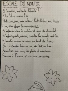 A la veille des vacances, nous avons cherché, par équipes, des verbes sur le thème du repos et des vacances et avons écrit un poème,