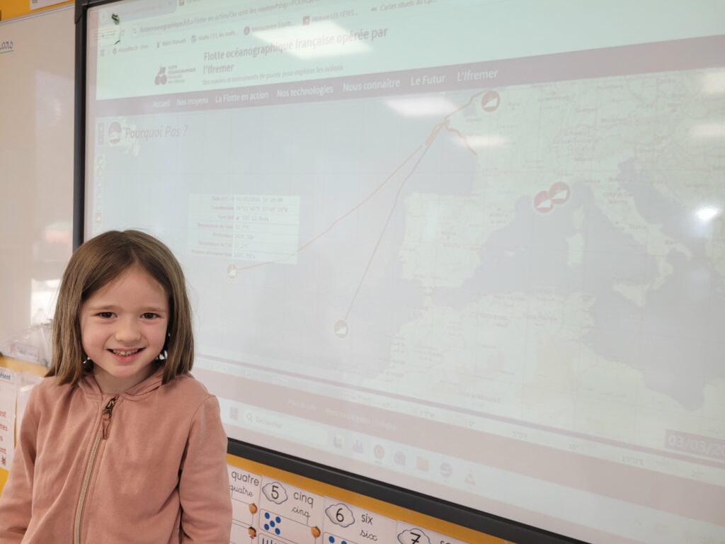 Nous lui avons écrit pour lui dire combien nous sommes heureux de suivre son aventure ! Grâce à la carte en ligne, nous pouvons suivre le trajet du bateau et découvrir les étapes de son voyage. Ses photos et son journal de bord nous passionnent. Nous lui avons posé beaucoup de questions sur la vie à bord et sur les animaux marins qu’elle pourrait observer.